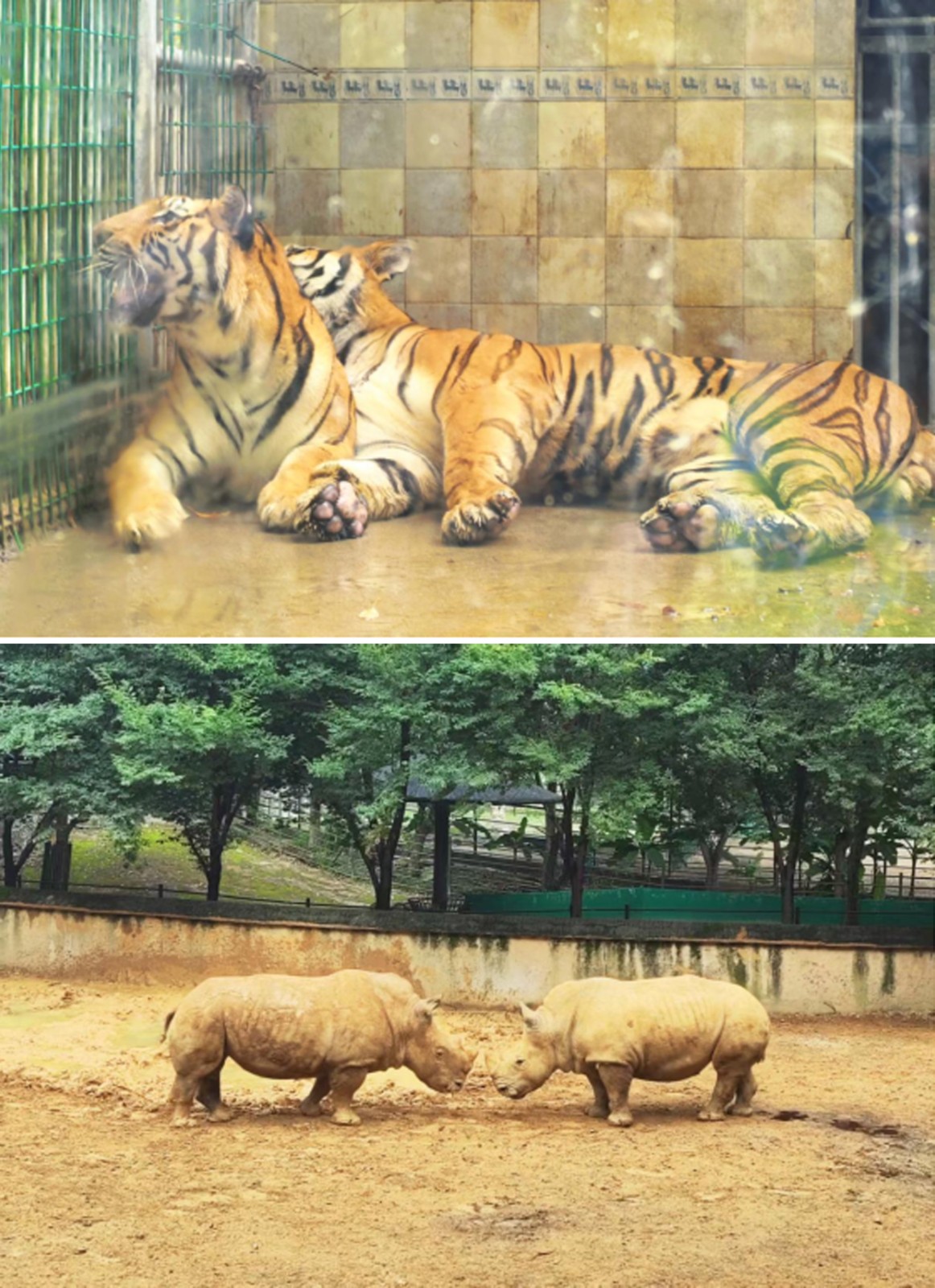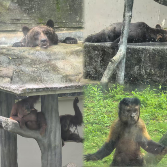 在老虎園區里,威風(fēng)凜凜的白虎和東北虎隔著(zhù)籠子互相打量,時(shí)而發(fā)出低沉的吼聲交流,而另一邊的兩頭東北虎則親密地緊挨在一起打盹,斑駁的樹(shù)影灑在它們金黃的皮毛上。不遠處的犀牛區,兩只體型龐大的白犀牛正在上演領(lǐng)地之爭,它們用粗壯的角互相頂撞,揚起陣陣塵土,發(fā)出沉重的鼻息聲;非洲大羚羊區最是熱鬧,高大的羚羊們溫順地低下頭,伸著(zhù)脖子吃著(zhù)小朋友親手投喂的食物,長(cháng)長(cháng)的睫毛在陽(yáng)光下忽閃忽閃。樹(shù)冠間,靈巧的長(cháng)臂猿扒著(zhù)樹(shù)干蕩著(zhù)秋千,偶爾還會(huì )停下來(lái)好奇地觀(guān)察下方拍照的游客。園區主干道上,飼養員牽著(zhù)一匹可愛(ài)的袖珍小馬漫步,珍珠馬的脖子上系著(zhù)的鈴鐺隨著(zhù)步伐發(fā)出清脆的聲響。整個(gè)園區洋溢著(zhù)人與動(dòng)物和諧相處的氛圍。